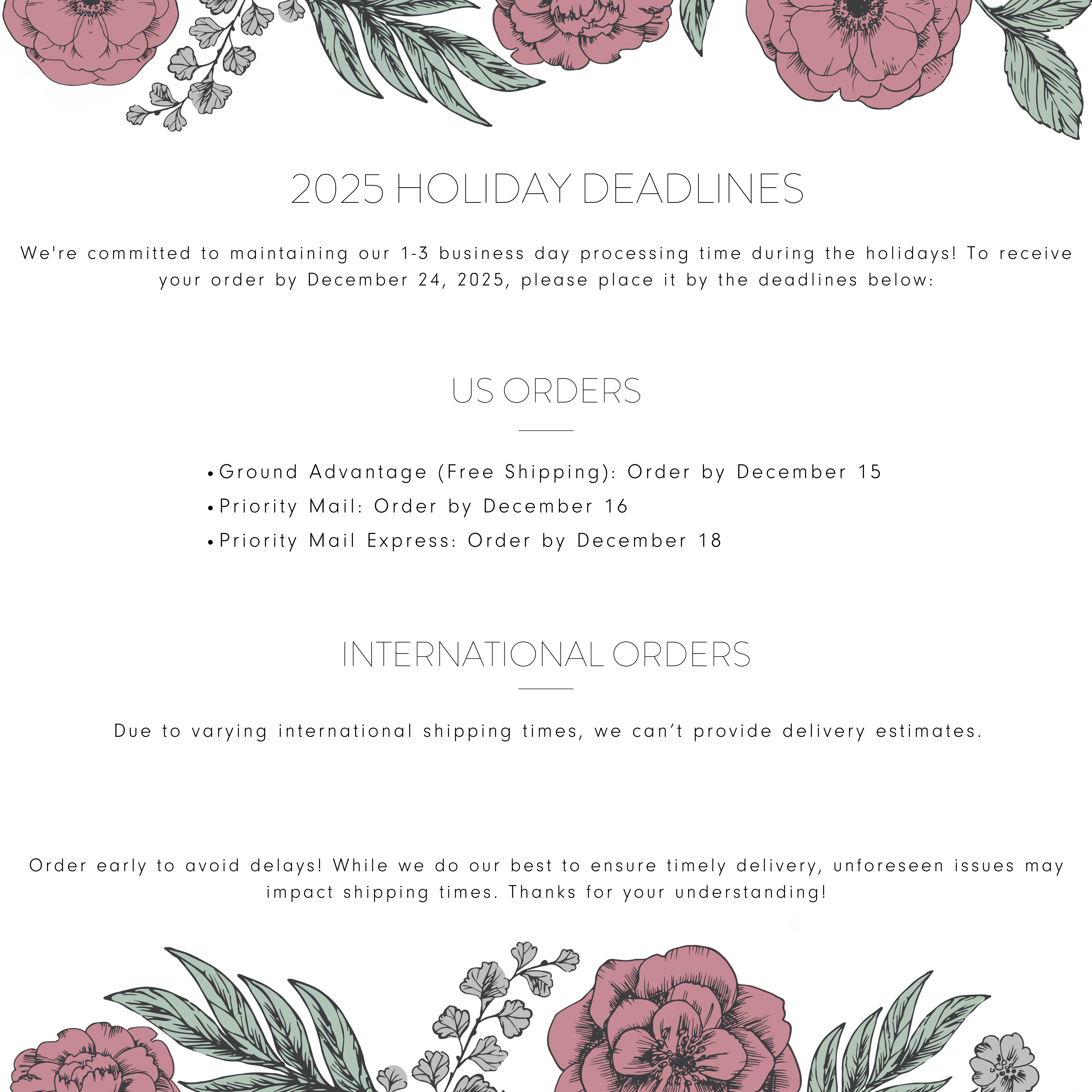 Click here to review our HOLIDAY SHIPPING DEADLINES