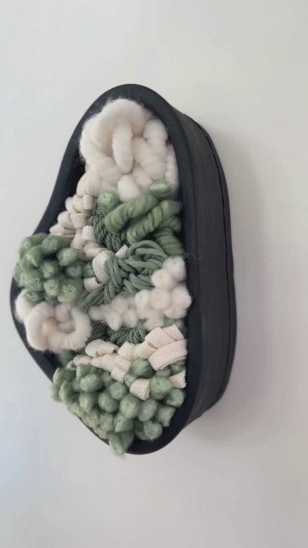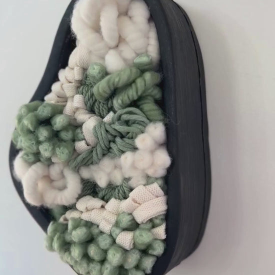 Featuring a curved terracotta clay frame with a brushed black finish, this piece is filled with soft, textural fibers in earthy sage, aloe greens, and warm creams. The result is a modern, botanical inspired artwork with rich depth and gentle movement. It fits beautifully in living rooms, entryways, bedrooms, or gallery style spaces where organic texture and handcrafted materials are valued. One of a kind and created with sustainable materials.