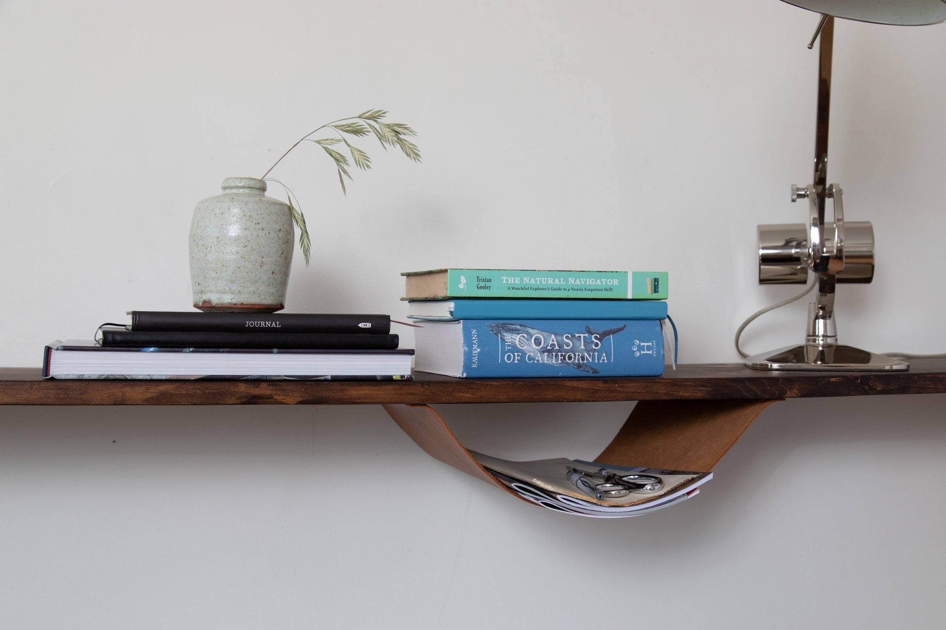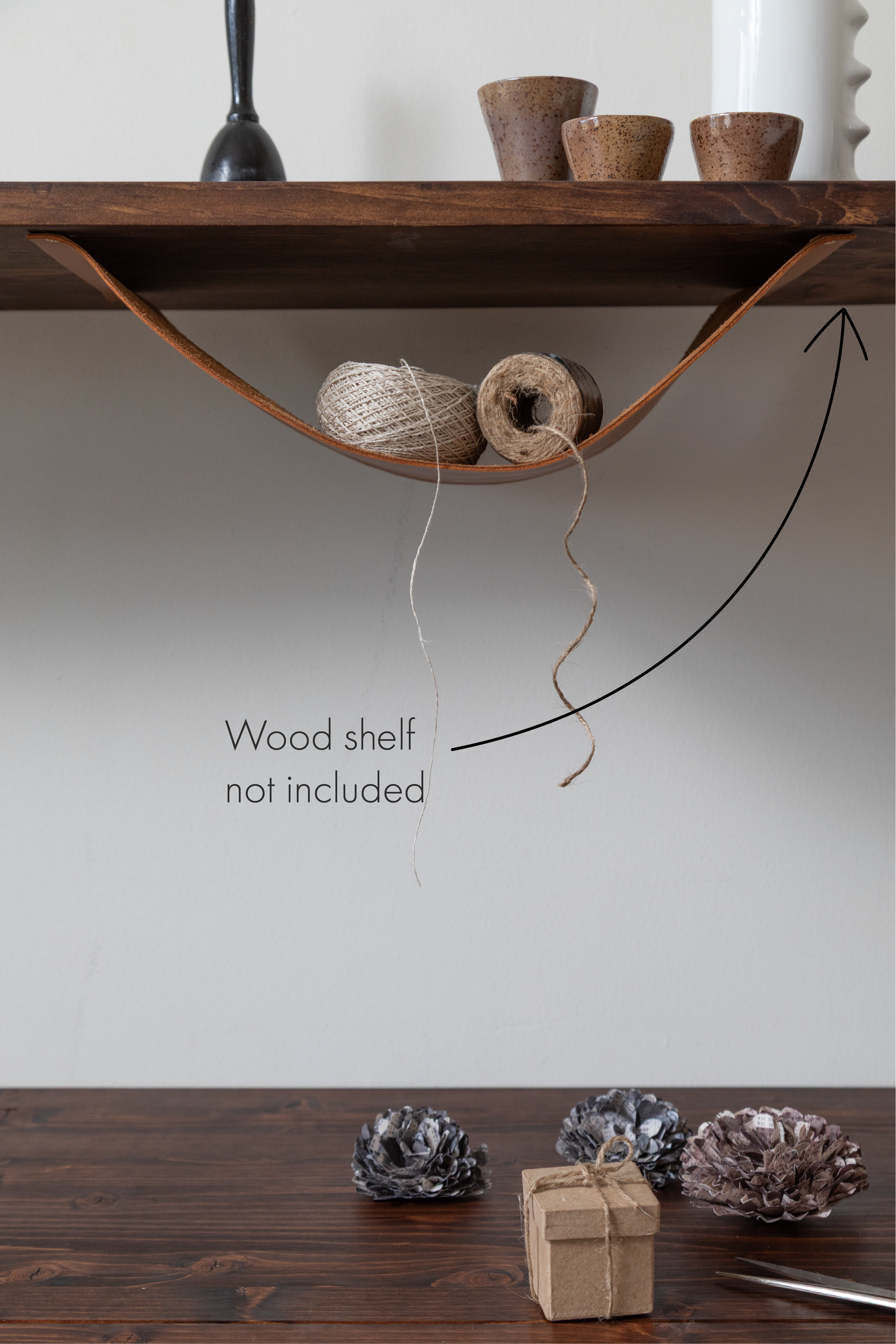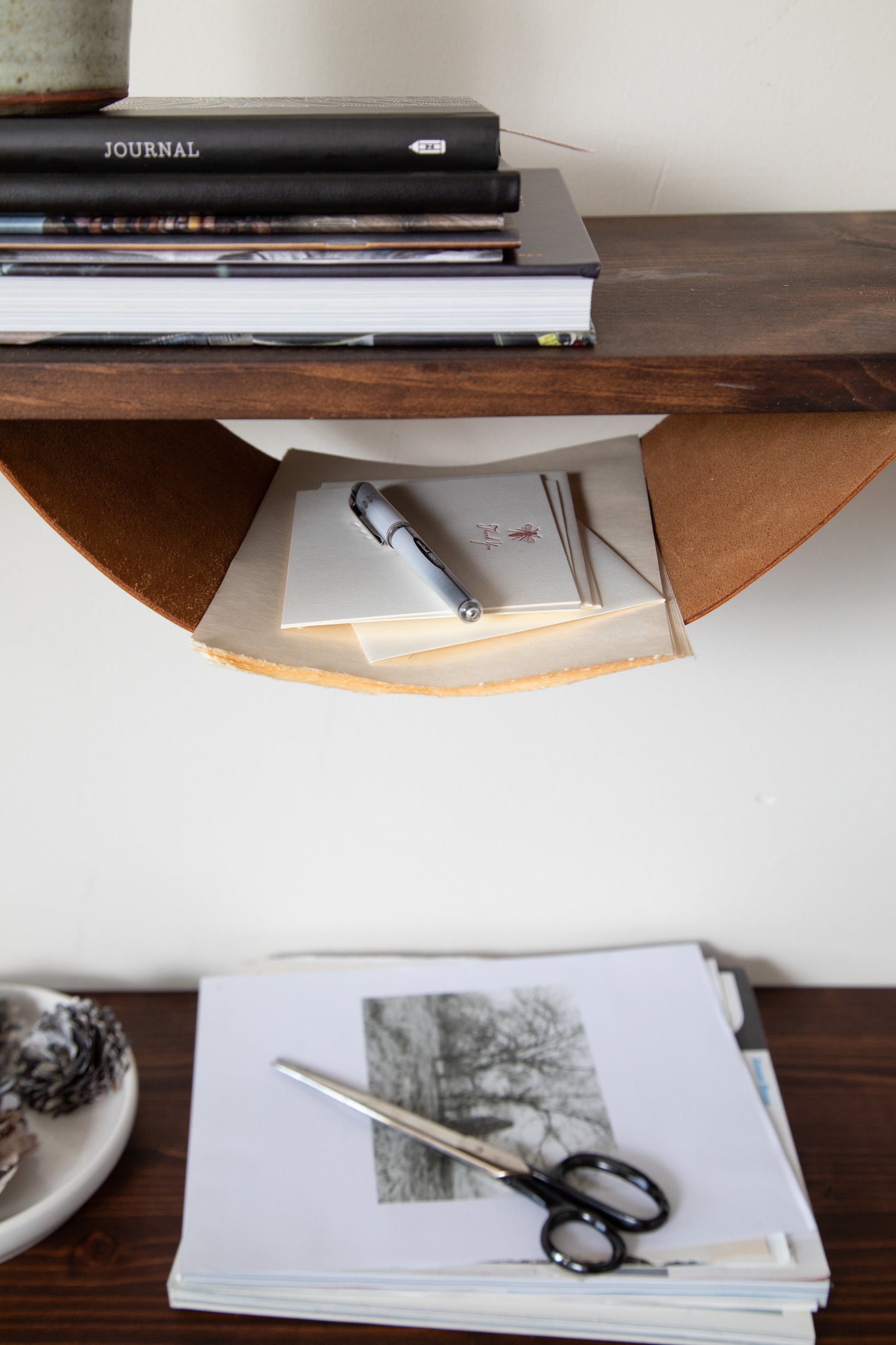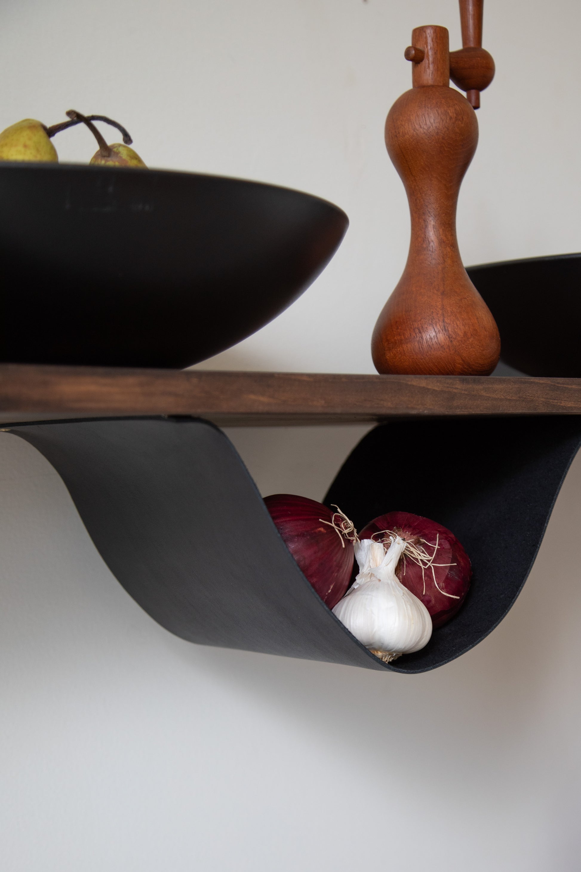 The Leather Sling Storage is a minimalist hanging organizer, handmade in the USA from sustainably sourced by-product leather with brass screws. Designed to mount under shelves or cabinets, it’s perfect for storing fruit, mail, books, or everyday essentials while complementing Scandinavian, Mid-Century Modern, Japandi, and Cottagecore interiors. A unique blend of function, sustainability, and timeless design.