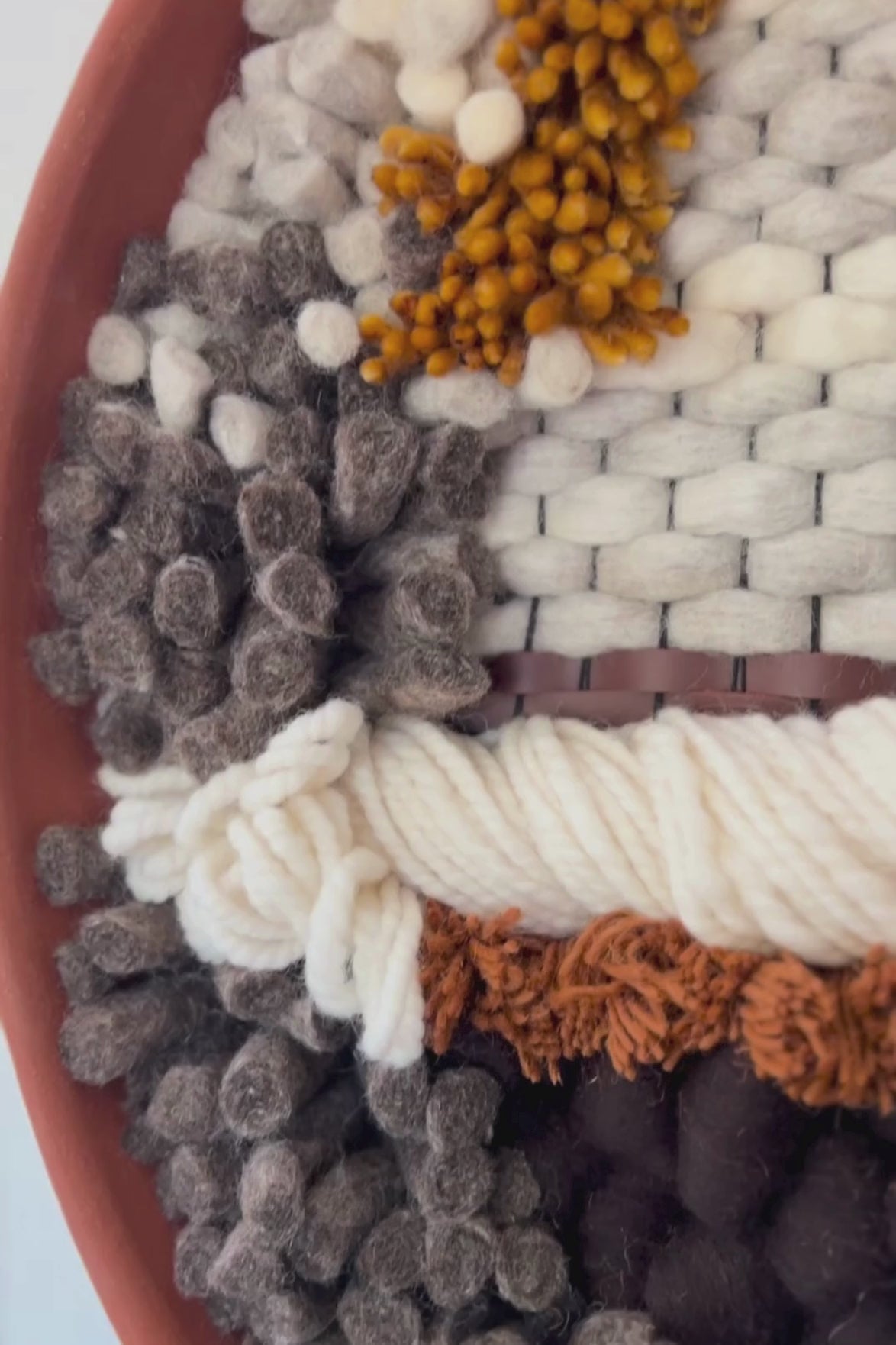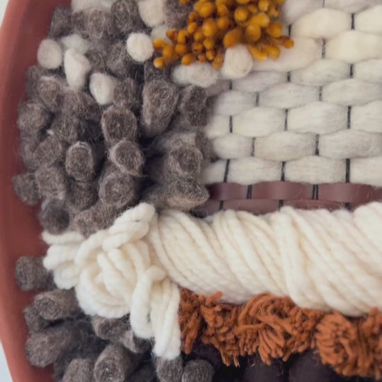 Made from a hand-thrown terracotta clay frame and featuring a mix of natural wool, vintage yarns, and byproduct leather. This one-of-a-kind wall sculpture blends rich textures and organic materials to create a warm, grounding focal point for modern interiors. Each element is thoughtfully composed, making it an ideal statement piece for homes, boutique hotels, and wellness spaces seeking an earthy, refined aesthetic. Sustainably handmade, it bridges art and design with tactile depth and timeless craftsmanship.