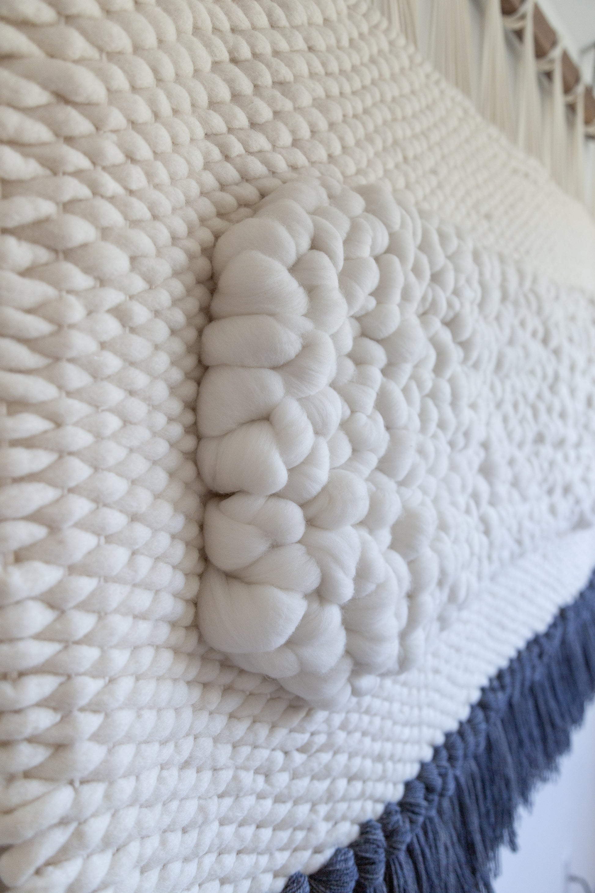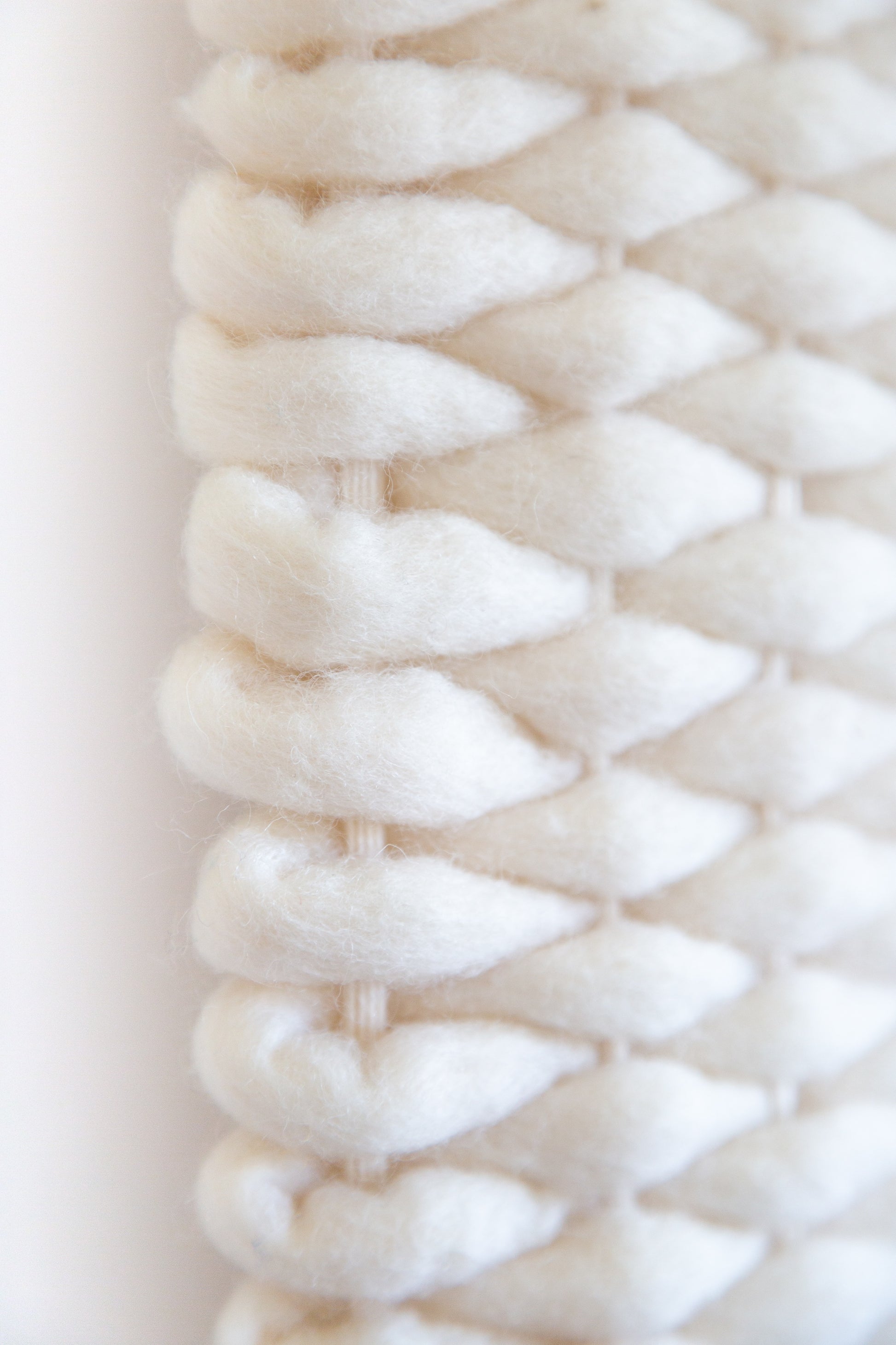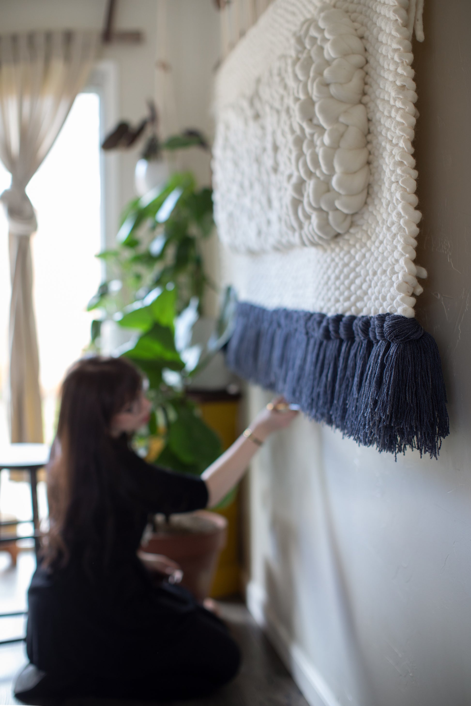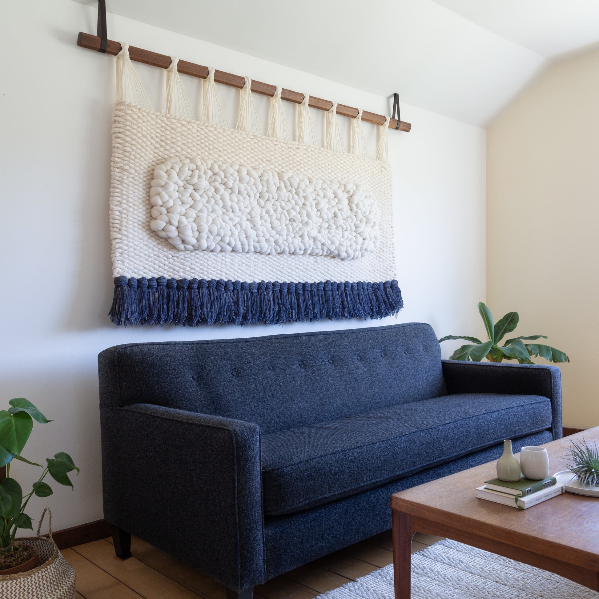 This extra-large scale handwoven tapestry weaving has a unique story. A single sheep named Peanut provided a portion of the wool and inspired the name of this textile piece. While working on large works for a gallery exhibit in Sonoma, California this piece came to life in the most unexpected way. My vision was to create a minimal and modern wall hanging that would suspend from a large oblong octagon piece of walnut wood that I had custom-designed specifically for this piece. I organically created the upper woven white on white shape with different depths and textures, but I was struggling with how to finish the piece. After sifting through some old scrap yarn, I came across a long-forgotten blue fiber.