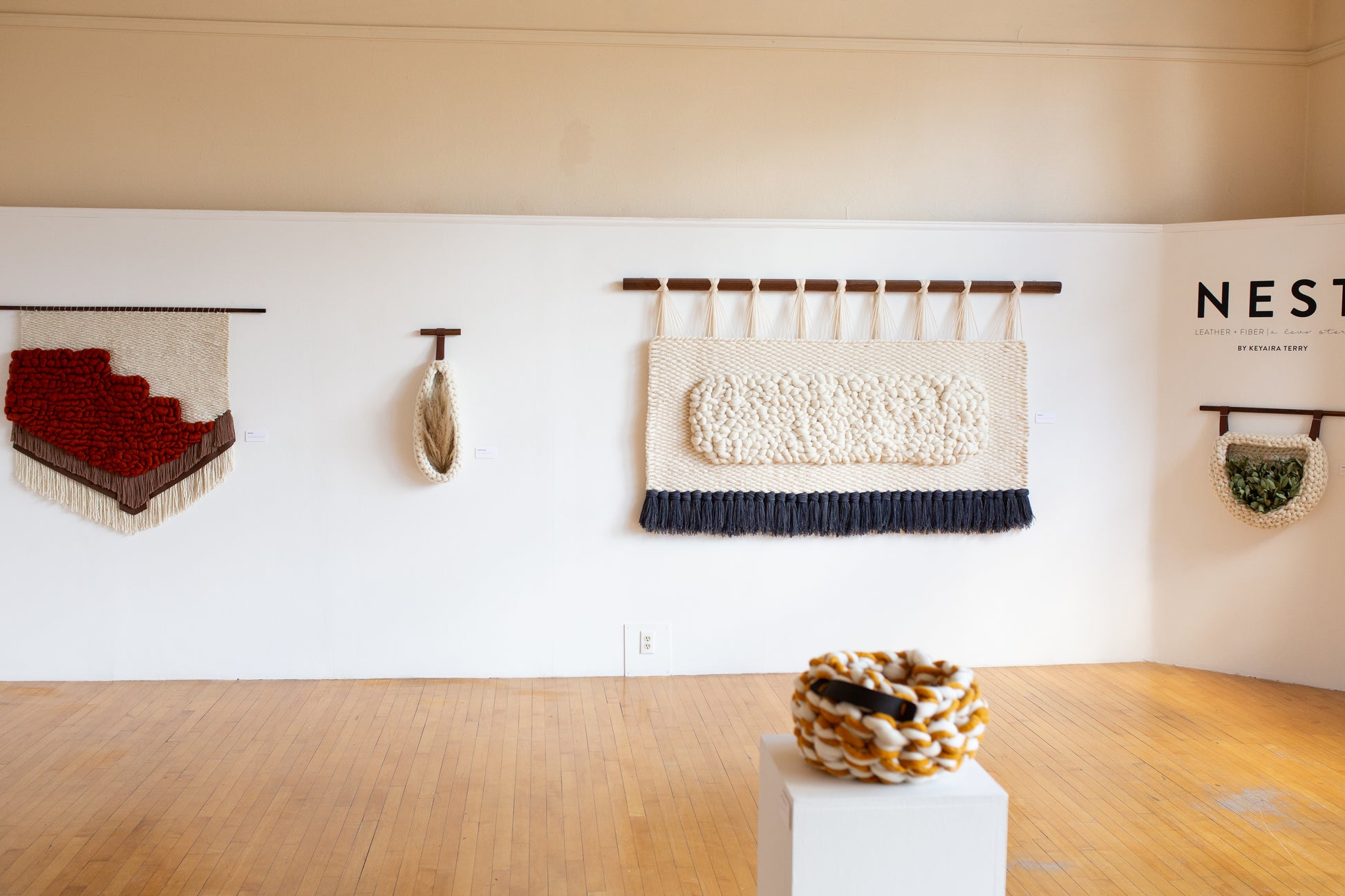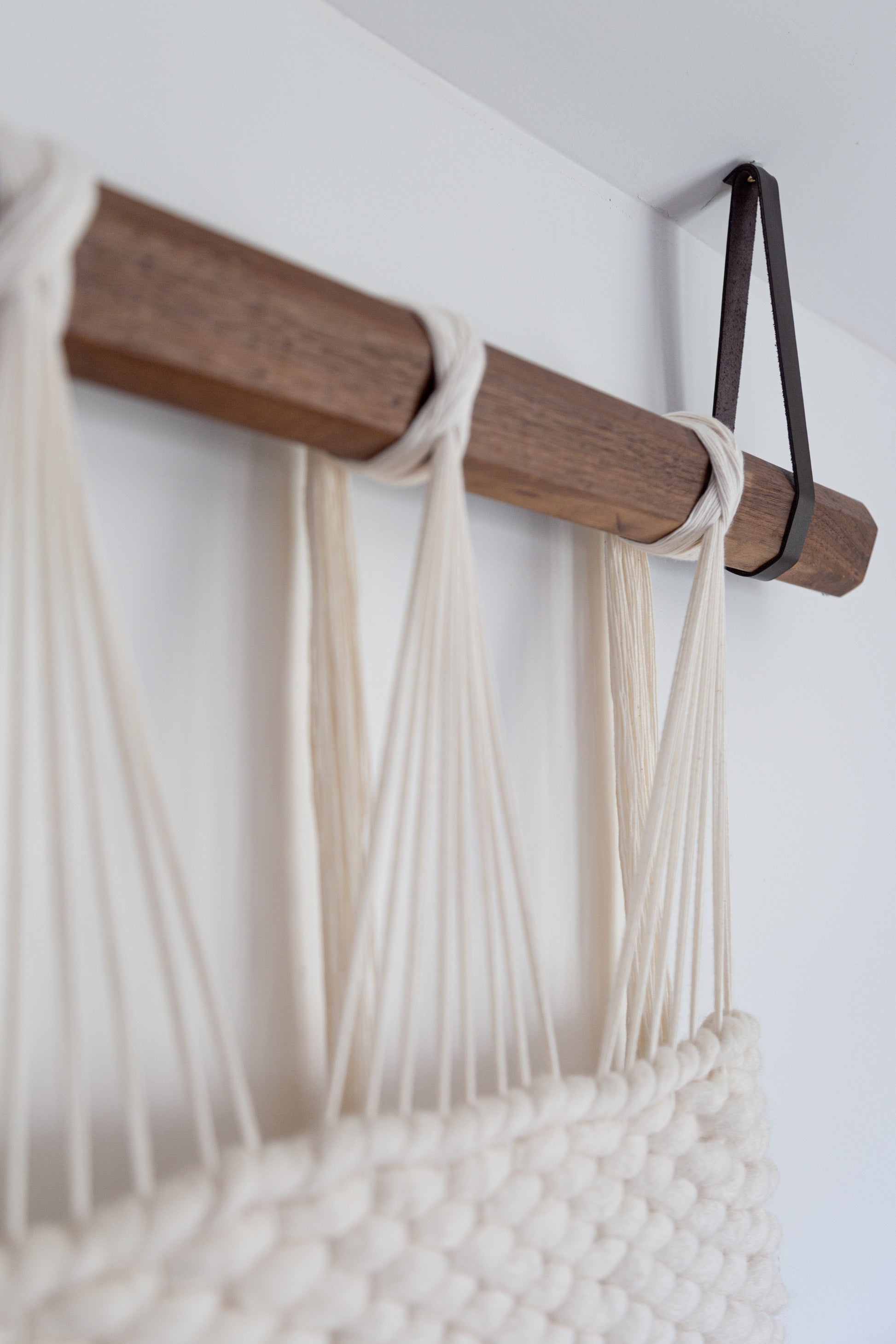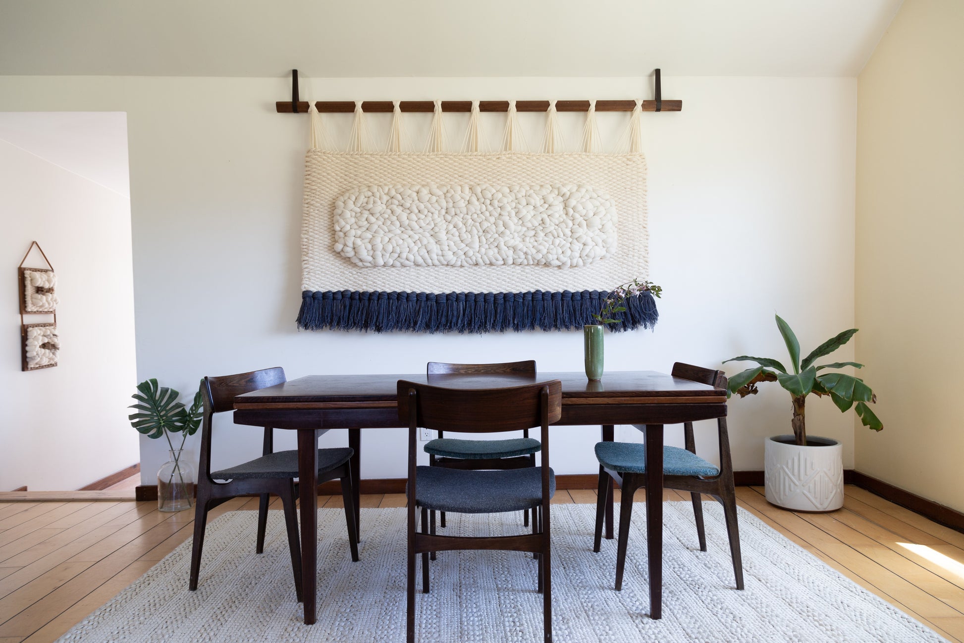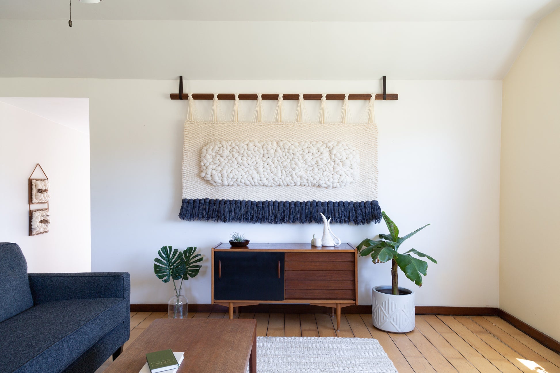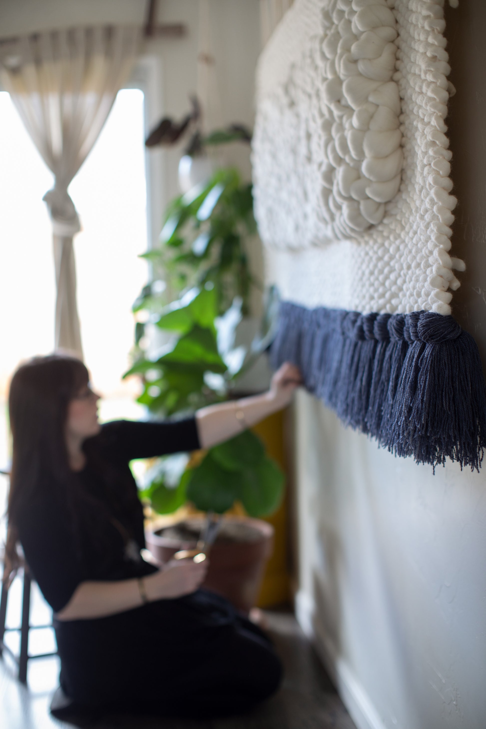 This extra-large scale handwoven tapestry weaving has a unique story. A single sheep named Peanut provided a portion of the wool and inspired the name of this textile piece. While working on large works for a gallery exhibit in Sonoma, California this piece came to life in the most unexpected way. My vision was to create a minimal and modern wall hanging that would suspend from a large oblong octagon piece of walnut wood that I had custom-designed specifically for this piece. I organically created the upper woven white on white shape with different depths and textures, but I was struggling with how to finish the piece. After sifting through some old scrap yarn, I came across a long-forgotten blue fiber.