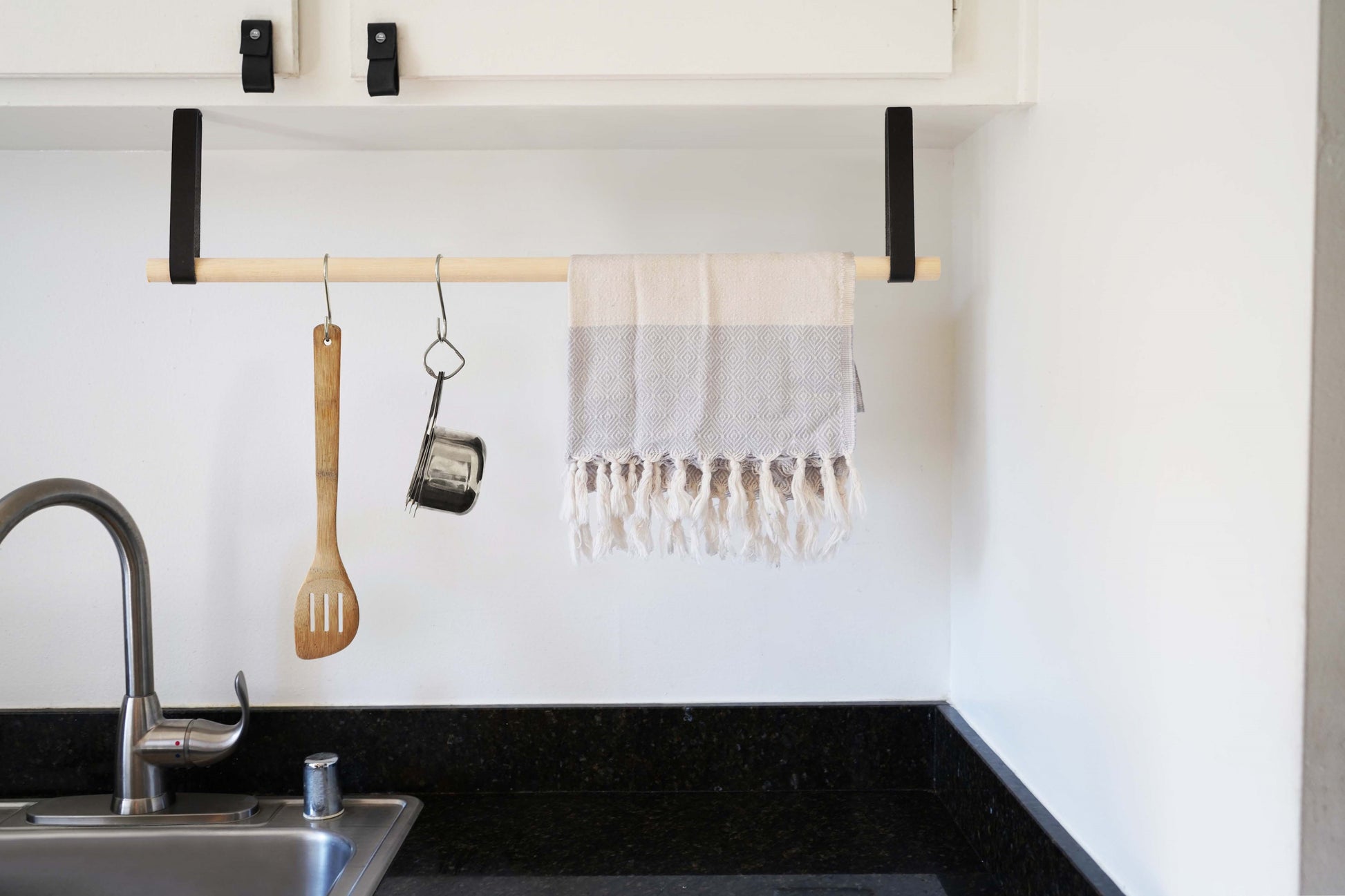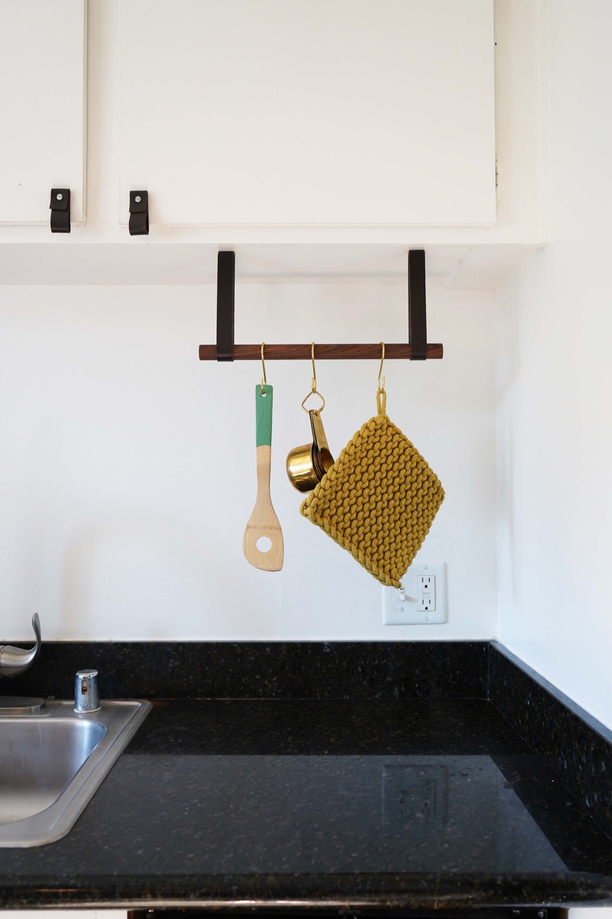 Maximize your counter space with our game-changing under-cabinet Suspended Storage System, perfect for kitchens, bathrooms & workspaces. This expertly crafted solution allows you to clear & organize countertops with ease, making it ideal for drying hand towels, storing tape and craft supplies as well as hanging mugs, or keeping utensils within reach – simply add our sustainable leather + metal hooks. Mindfully designed with functionality & timeless aesthetics.