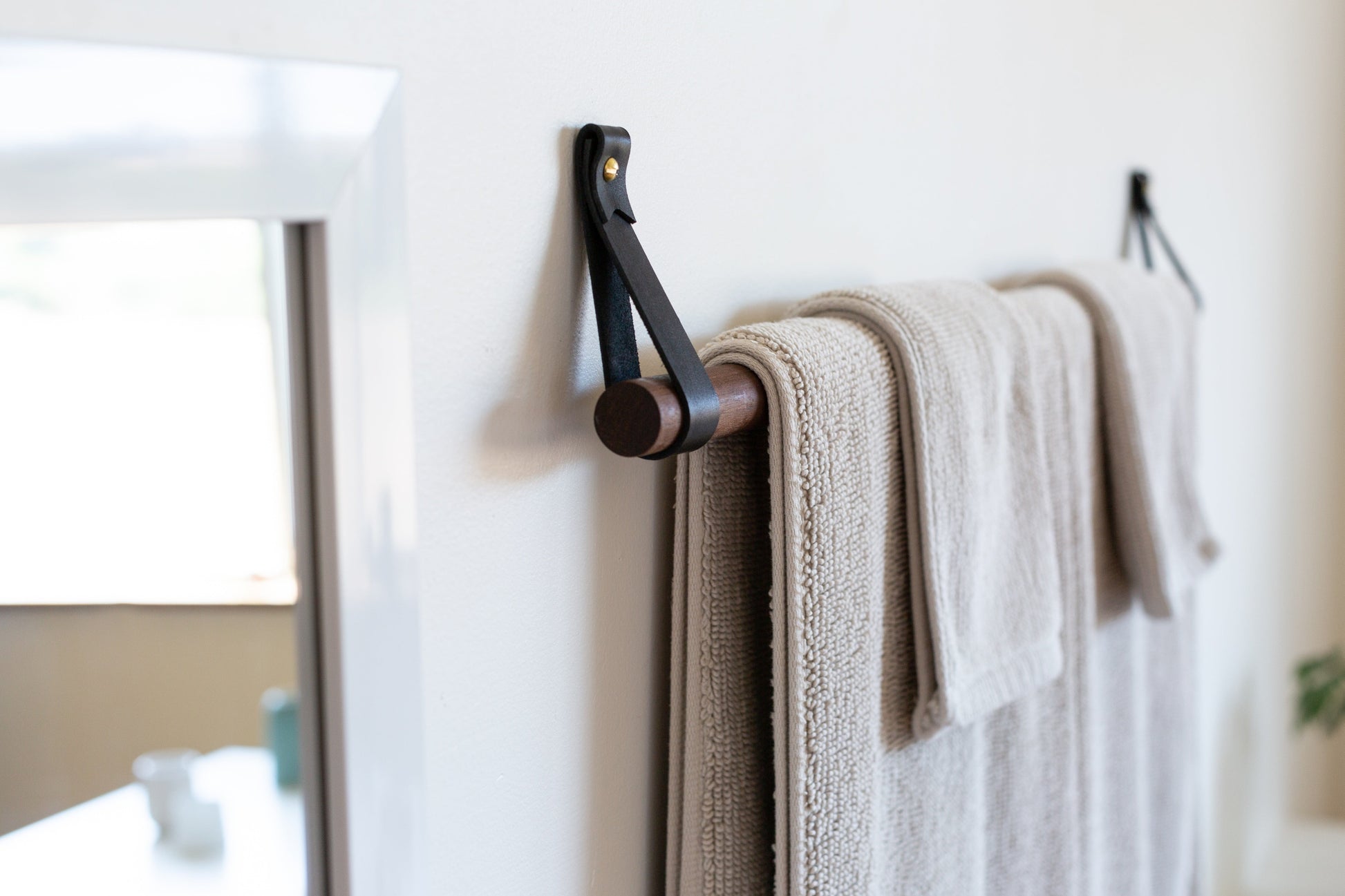 Introducing our exquisite Wall Mounted Hanging Dowel, a versatile and elegant solution for organizing your space. With its two leather straps & wooden dowel, you can effortlessly add a touch of sophistication & organization to any room. Use it in your bathroom for towels, in the kitchen for mugs and utensils, in the entryway for hats, or in storage rooms for brooms & cleaning supplies. Its simple design easily adapts to various styles, from farmhouse to Scandinavian to eclectic. Elevate your space with our functional and high-end Wall Mounted Hanging Dowel.